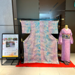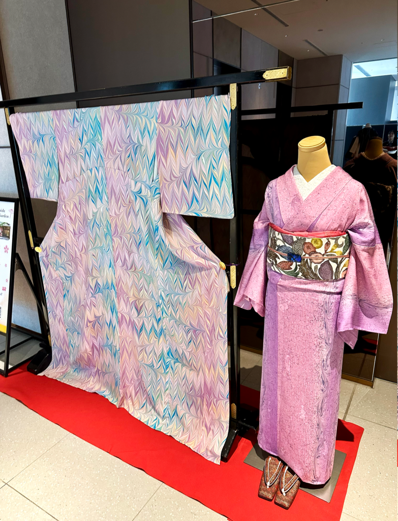 また、着物の隣には、同じく墨流し染の着物に、東京を代表する染色技法である「江戸紅型」の帯を合わせた、バレンタインカラーをイメージした一着も展示しております。